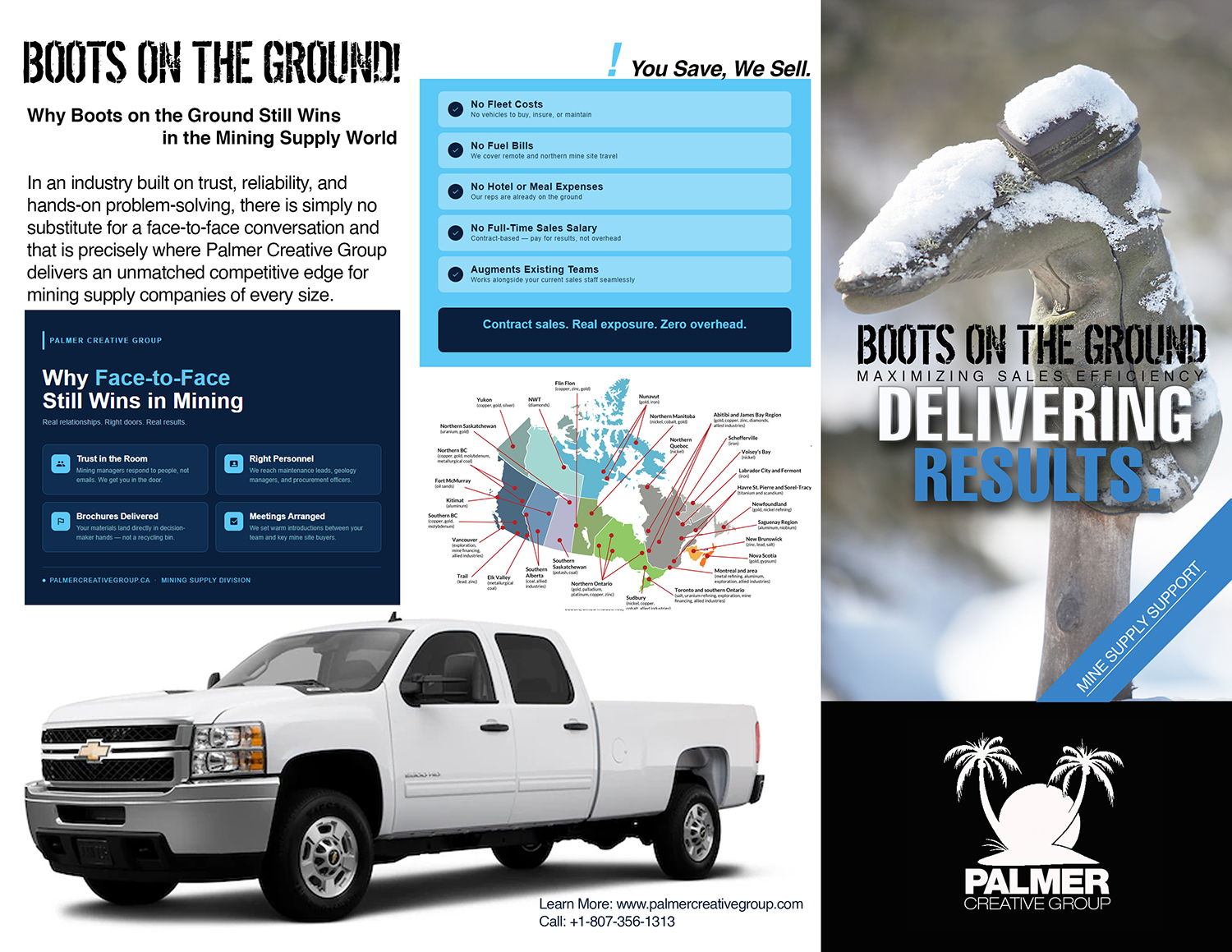 “Combining boots-on-the-ground sales principals with incredibly attractive media from drones, videos, interviews, imagery to stop the scroll and create opportunities to sell more of our client’s products to Producing Mines in Canada. We’re in the offices of key Producing Mines weekly – in front of Managers that need products and services: you pay a low monthly fee and we deliver your messaging / brochures / videos / samples to these key personnel.”